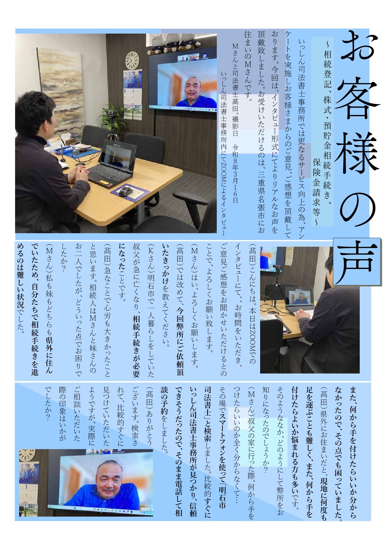 三重県名張市M様インタビュー ~相続登記、株式・預貯金相続手続き、保険金請求等~ R8.3.16 お客様の声 isshin 2026年3月24日インタビュー, お客様の声, メッセージ 今回の“お客様の声“は、三重県名張市にお住まいのM様よりインタビュー形式にて頂戴致しました。お客様からのよりリアルなお声を是非ご覧くださいませ。 ≫≫pdfファイルでの表示はこちら ≫≫下記画像をクリックすると拡大表示されます。